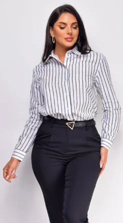 Lencia White Black Striped Button Down Top